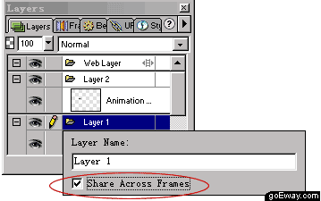 十、最后一步啦,打開layers面板,選擇layer1標簽,雙擊。在跳出的對話框中把share across frames前面的鉤選上。使圖層1進行共享。