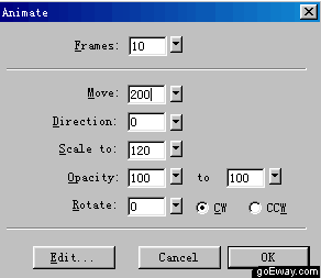八、按f8鍵,在符號屬性對話框中選擇其類型為animation。點擊ok按鈕。在緊接著跳出來的動畫窗口中再進行如下設置。frames設為10幀。move選項設為200(隨便設置一個數(shù)字好啦)。scale to 選項中填入120。點擊ok按鈕表示確定。