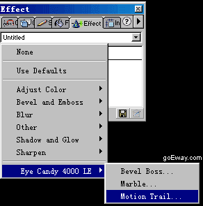 四、打開(kāi)effect面板,如果當(dāng)前文件中沒(méi)有這個(gè)面板,請(qǐng)選擇window->effect。在下拉菜單中選擇fireworks4自帶的外置濾鏡eye candy 4000 le->motion trail
