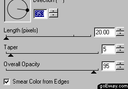 五、在這個(gè)濾鏡的對(duì)話(huà)框中進(jìn)行如下設(shè)置,角度為353度,length設(shè)為20,taper設(shè)為5,overall opacity設(shè)置為95。點(diǎn)擊ok按鈕。完成衛(wèi)星尾巴的制作。