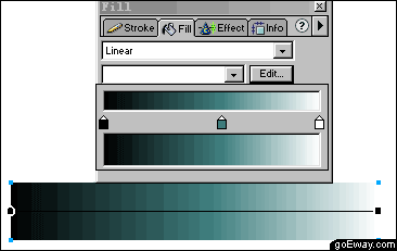 六、在fill面板中,對這個矩形進行填充顏色的編輯,類型為linear。點擊edit按鈕,對顏色面板進行設(shè)置,從左到右依次是黑 > 綠 > 白。