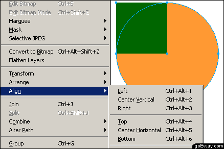 四、菜單modify中選擇align命令,分二次執行left和top命令,使二個選中的物體上對齊和左對齊。看下圖