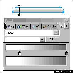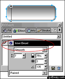 二、選擇這個圓角矩形,打開fill面板,填充類型選為linear,打開edit按鈕編輯漸變色帶,如下圖所示,色帶有白和黑組成。三、設置完漸變色后,打開effect效果面板,類型為inner bevel,在其下拉菜單中選擇smooth,深度選為7,其他的按默認的設置,這樣基本的框框就做好了,看下圖所示。 四、再用矩形工具做二個矩形,其中一個矩形需要在其object面板中設置其roundness為30。顏色此時隨自己喜歡,為了看得清楚,為了圓角矩形我用黑色填充,直角矩形為灰色填充。五、全選二個矩形,使用菜單modify->combine->punch命令,執行命令后,形狀如下:六、打開fill面板選用linear類型進行填充,編輯效果及漸變方向如下圖所示。七、把這二個形狀按如下位置放置。八、用工具面板中的文字工具輸入文字。你可以輸入自己需要的文字。九、把文字放在按鈕的上面。這個按鈕就全部完成了。