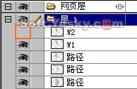 再給這一路徑隨便取個名子,就叫“w1”吧,然后把該路徑再復制一個,取名為“w2”并把“w2”所在對象層的“眼睛”暫時關閉。因為一會我們還要用“w2”這個路徑去“切割”另一個對象,所以暫時將“w2”進行保留。