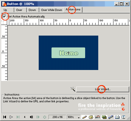 最后,我們切換到active area,在這里可以設定與鏈接有關的參數,所有設定的內容最后都會輸出成標準的html代碼,我們要做的只是簡單的將輸出的代碼復制到網頁中的相應位置。set active area automatically會自動設置一個切割,切割的大小與按鈕的大小是一致的,建議使用這個設置,然后點擊link wizard進行最后的設置。