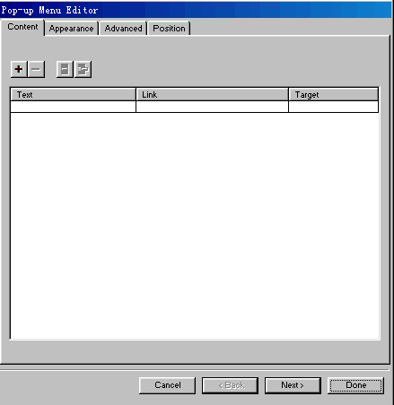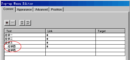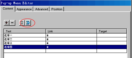 彈出的pop-up menu editor(下拉菜單編輯器)對話框包含四個標簽,分別對應不同的功能(如圖4)。
