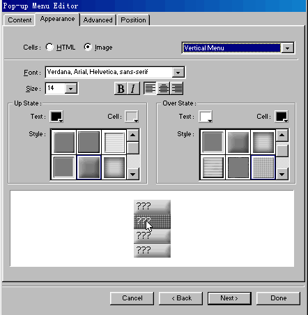 在輸入并設置好菜單選項后,選擇appearance選項卡。在這里,我們可以設置下拉菜單的外觀屬性。大家自己試一下就會熟悉,而值得注意的是up state與over state代表的是菜單的兩種狀態。在正常顯示時是up state而當鼠標移動到菜單選項上時就以over state狀態顯示。我們可以分別在style中為這兩種狀態設置不同的顯示風格(如圖7)。