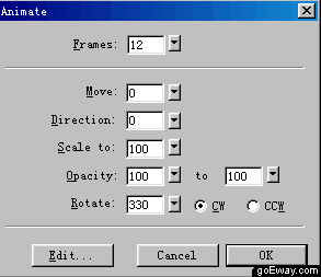 六、在緊接著跳出的窗口中進行這樣的設置: frame(幀):設為12幀。rotate(旋轉角度)為330。點擊ok按鈕,在緊跟著跳出的警告窗口中再次點擊ok按鈕。