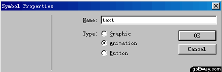 五、此時按路徑排列的文字處于被選擇狀態。按f8鍵,在彈出的符號屬性窗口中設置這個動畫的名字為text。類型為animation,點擊ok按鈕確認。