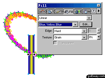 十一、選擇layer2層。在工具面板中選擇矩形工具,在如下圖的位置畫一個矩形,打開info面板設置其w為20,h為128。在fill面板中選擇填充類型為linear,填充的顏色點擊下拉菜單,選擇 blue,yellow,blue,如下圖。