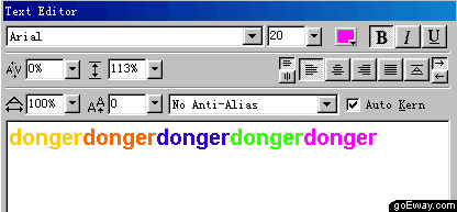 二、 選擇工具面板中的文字工具,在文字編輯器中輸入如下文字,在這兒我輸入了五個donger英文字母,每個donger選擇了不同的顏色。如果您需要做另外的效果,可以輸入自己需要的文字及顏色。點擊ok按鈕確認