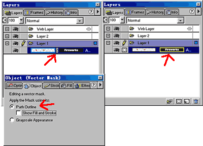 9、選中動畫,然后在layers面板里點擊圖中箭頭所示,把遮照之間的關系取消;然后選取字體,選取字體后object面板會出現兩個選項,選path outline(箭頭所指),選好后在layers面板里恢復遮照之間的關系。