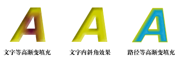 接下來(lái)我們來(lái)試驗(yàn)一下文字。你會(huì)發(fā)現(xiàn)文字直接應(yīng)用等高漸變填充后仍然是生硬的方形填色。只有你把文字轉(zhuǎn)為路徑convert to path(快捷鍵ctrl+shift+p),填充顏色才可以沿輪廓線漸變。這里我們放了個(gè)內(nèi)斜角的效果做比較,可以看到等高漸變填充的表現(xiàn)更出色。