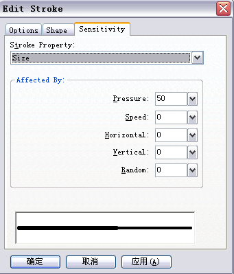 在彈出的stroke option對(duì)話框中,設(shè)置筆觸的寬度(size)為5,點(diǎn)擊下方advanced按鈕,在彈出的advanced...面板的option選項(xiàng)卡中設(shè)置tips為10。點(diǎn)擊sensitivity選項(xiàng)卡,設(shè)置其中的press為50%(如圖7)。