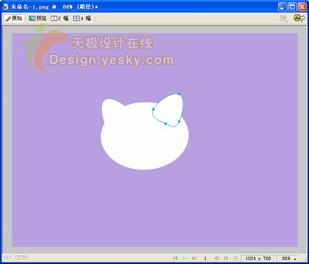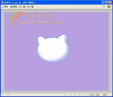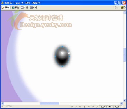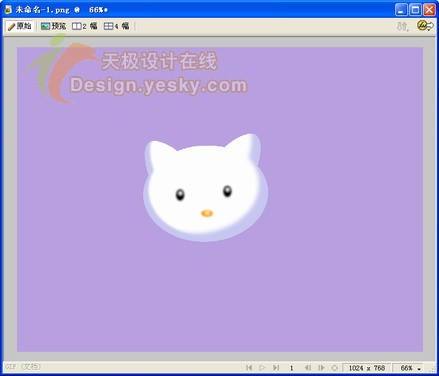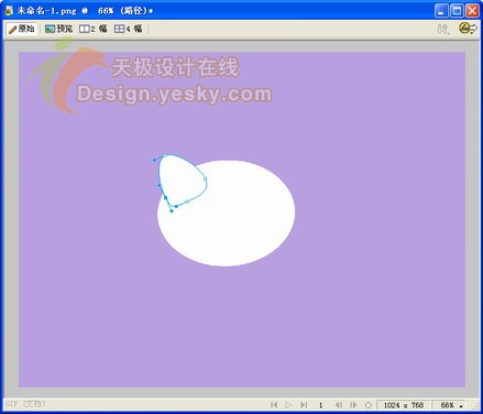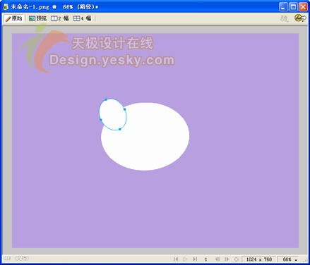 1.在fireworks中新建一個大小為1024×768像素的文件。將畫布顏色設置為紫色,將顯示比例調整為66%進行圖像編輯。繪制一個橢圓,如圖1所示,填充顏色為白色,筆觸設為無。design.yesky.com©天極軟件頻道設計在線原創©2045324542