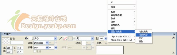 6.下面我們對貓臉部進行適當的光影效果添加,這就需要使用內陰影效果。選中該路徑,在屬性面板中選擇【陰影和光暈】|【內側陰影】,如圖6所示。