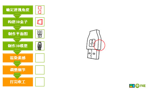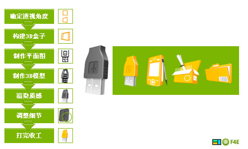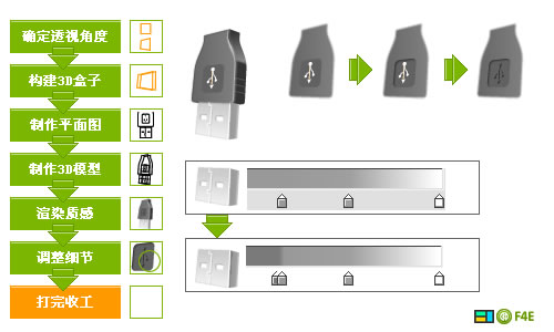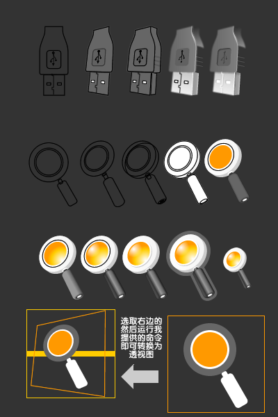 用平面軟件做立體圖標的基本流程也是“先建模,再渲染”,然而這些都得自己去做,雖然在逼真度上和3d軟件還是有差距,但是平面軟件制作圖標可以有更多變的風格和效果,給了設計者更多發揮空間。下面是我畫一個usb接頭的過程。