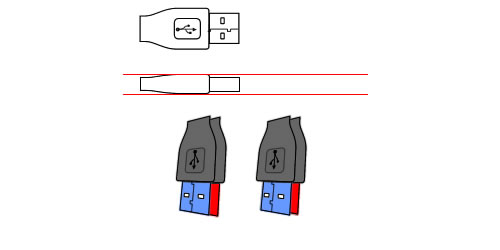 看看這個圖片,上一步做的東西真的失真了嗎?沒有呀!但是真的有點怪怪的——原因是我們把usb插頭的金屬部分和塑料部分放在一個面上了。再仔細看看上圖。側面來看其實不是在一個面上的。怎么讓他們各自到各自的面上去呢?這個只有靠感覺去微調一下了。藍色的面向右移動一象素,紅色的面向上移動兩象素,左一象素。