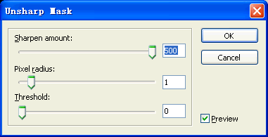 最后選擇filters(濾鏡)-sharp(銳化)-unsharp mask(鈍化蒙板),分別設置為500,1,0。