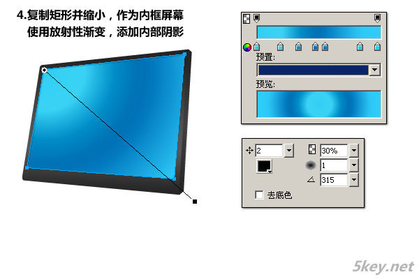 四、復制矩形并縮小,作為內框屏幕,使用放射性漸變,添加內容陰影