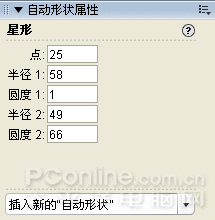 2、在“自動形狀屬性”面板上,單擊“插入新的自動形狀”下拉菜單,選擇“星形”,對于“星形”自動形狀對象的屬性,做一個設置,將“點”設為25,其余各項保持默認設置即可。
