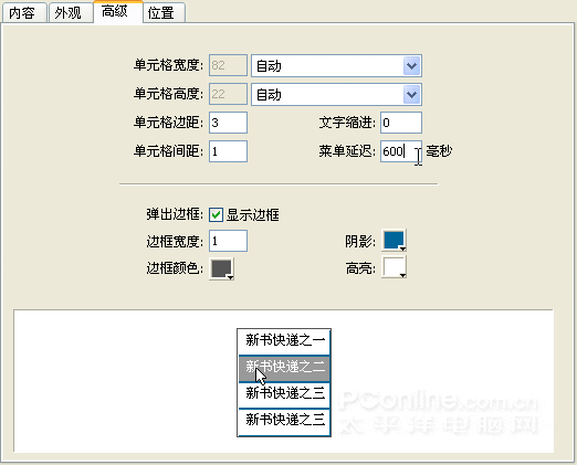 有關(guān)彈出菜單的制作方法,不是我們本部分的講授重點,有關(guān)css格式控制的地方,才是需要我們注意的。所以本小節(jié)就通過一個簡單的彈出菜單的制作講解,使大家對于fireworks 8里面新增的css格式化菜單有一個初步的了解和印象,以更好的進(jìn)一步的來使用它。