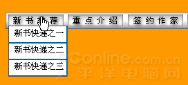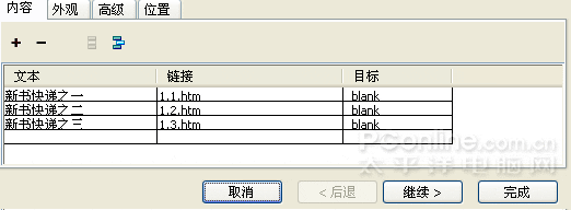 3、選中“新書推薦”欄所在熱區(qū),選擇菜單“修改|彈出菜單|添加彈出菜單”命令。在“內(nèi)容”設(shè)置對話框內(nèi),將彈出菜單內(nèi)容的文本、鏈接及其目標(biāo)等都設(shè)定完畢,單擊“繼續(xù)”按鈕,轉(zhuǎn)到“外觀”設(shè)置對話框。