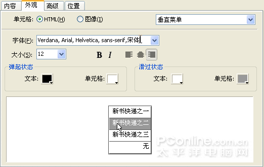 4、在“外觀”設(shè)置對話框內(nèi),選擇單元格格式為“html”,將字體、文本大小、彈起狀態(tài)、滑過狀態(tài)的文本、單元格顏色都做一個設(shè)置。設(shè)置完畢,單擊“繼續(xù)”按鈕,切換到“高級”設(shè)置對話框。