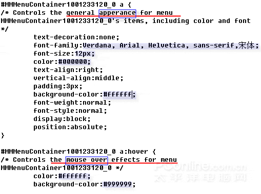 9、使用html編輯器或者記事本(使用記事本其實足夠了,因為文件并不復(fù)雜)打開這個css文件。我們可以發(fā)現(xiàn)一些html代碼在里面,如果我們對html一竅不通也不要害怕,你可以憑借著剛才在fireworks里面設(shè)置菜單的印象來尋找一些與彈出菜單的設(shè)置有關(guān)的內(nèi)容,比如我們在節(jié)選的一段css描述里面可以發(fā)現(xiàn)對于菜單對象的一些描述第一個劃紅線的地方所指示的“general apperance”也就是我們在“菜單編輯器”中進(jìn)行外觀設(shè)置的那一些內(nèi)容,仔細(xì)看可以看到里面有“font-family”,有關(guān)字體的設(shè)置;還有 “font-size”,有關(guān)字體大小的設(shè)置,具體到還有字體顏色、背景顏色、字體樣式等等內(nèi)容的設(shè)置,只要你稍微懂一些英文的話,下面這些應(yīng)該對你沒有什么大礙的。下圖中第2處劃紅線的地方是來設(shè)置鼠標(biāo)滑過時的狀態(tài)的,主要是對文本顏色和單元格背景色這兩方面進(jìn)行的設(shè)置。
