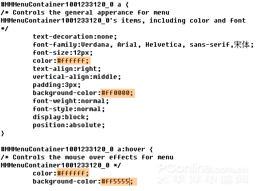 11、接下來,我們對該css文件的內(nèi)容做一個簡單的調(diào)整。如下圖所示的淡黃色區(qū)域所示,我們將彈出菜單的文本顏色、背景顏色、還有鼠標(biāo)已過時的文本顏色、及其相應(yīng)的背景顏色都做了一個簡單的改變。