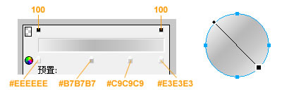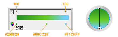 在這個圓的上面畫一個70x70的正圓形,改變填充類別為線性漸變,增加并調整漸變顏色,水平、垂直對齊于畫布(或對齊于它下邊兒的那個圓)。(圖04)