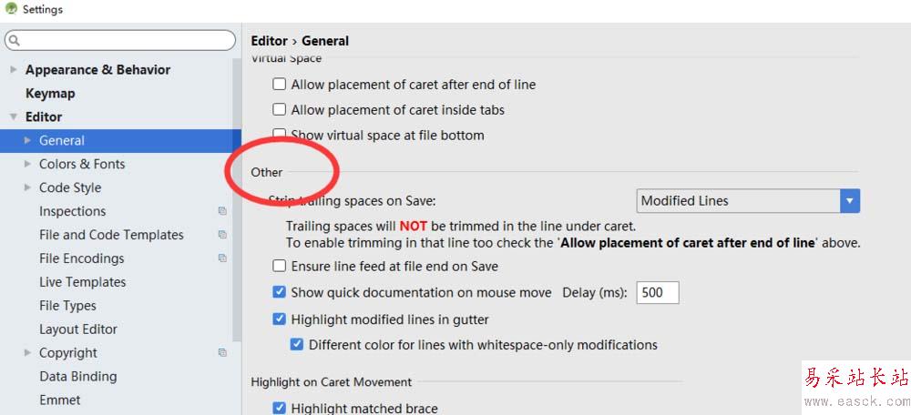 4、選中Other下選項,“Show quick documentation on mouse move”。選項后面還有相應的延遲時間設置,即設置光標移動到代碼上多久后顯示提示框,注意單位是毫秒。