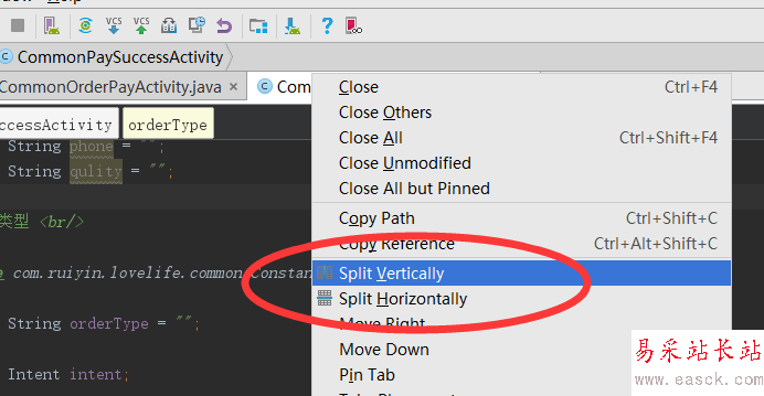 2、此時會彈出菜單彈窗,選擇Split Vertically ,即可實現左右比較兩個文件;選擇Split Horizontally,即可實現上下比較兩個文件。