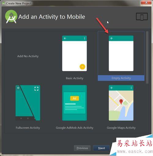 5、繼續(xù)點擊Next按鈕進(jìn)行下一步,我們需要通過形象友好的GUI模板,來選擇我們第一個Activity的樣式,如下圖所示: