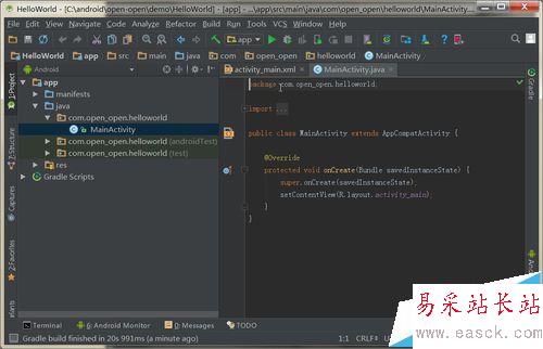 7、點擊Finish按鈕后,Android Studio開始創(chuàng)建并編譯應(yīng)用。編譯結(jié)束后,我們就可以看到Android Studio的IDE界面了,如下圖所示: