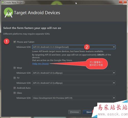 3、接下來需要選擇開發(fā)什么設(shè)備(可選“手機和平板”、“穿戴(Wear)”、“TV”,“車載(Android Auto)”等)上的應(yīng)用,以及確定最小SDK的版本號。Minimum SDK的作用是在應(yīng)用安裝前,會對設(shè)備的Android版本做校驗,如果設(shè)備的Android版本低于這個最小版本會阻止用戶安裝應(yīng)用,如下圖所示: