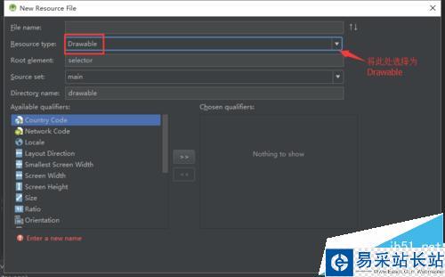 3、在彈出的界面中,將Resource type 修改為Drawable