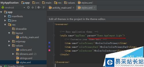 style name="AppTheme" parent="Theme.AppCompat.Light"。修改后為style name="AppTheme" parent="Theme.AppCompat.Light.NoActionBar".