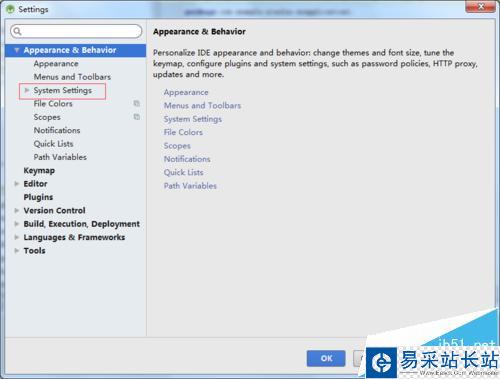 4、進入到了appearance&behavior選項中之后,再次進行選中system settings的選項。