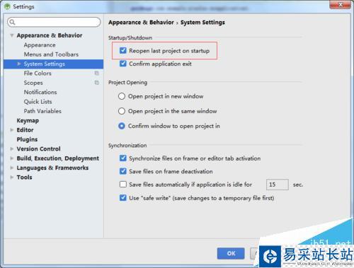 5、進入到了system settings的選項之后,reopen last project on startup的中默認是進行勾選上,所以會自動打開之前的項目的。所以把reopen last project on startup勾選去掉。