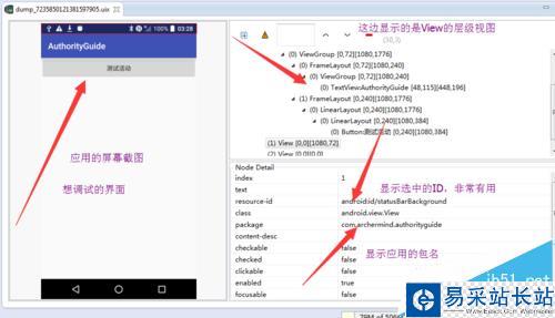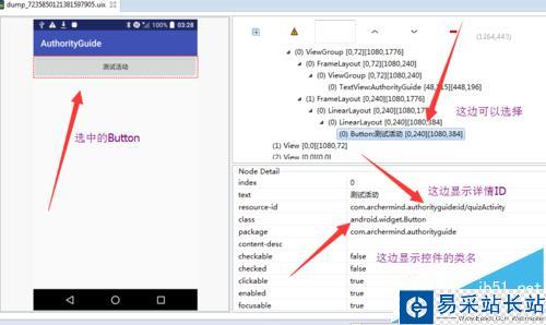 4、可以選擇你想測試的控件,右邊是層級圖,也可以選擇右邊,這樣左邊也看出來控件范圍,下邊顯示詳情