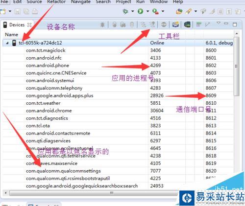 1、按照上面的步驟點擊Devices。里面顯示設備名,應用名稱以包名顯示,進程PID號,通信端口號,上面工具欄截圖工具。
