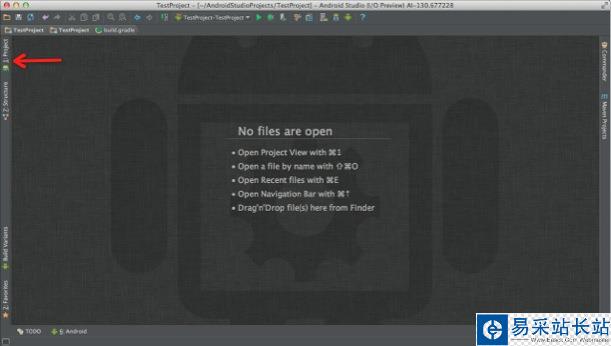 新建工程完畢后就進入了Android Studio主界面。第一次進去可能如下圖所示什么也沒有,點擊箭頭所示按鈕展開目錄結構,