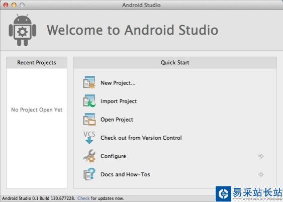 進入Android Studio,開始界面和Xcode有點類似,點擊New project新建一個工程,新建過程和在Eclipse上差不多,這里就不贅述了。下圖是開始界面: