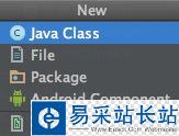 3.新建文件方式的不同,右鍵選擇New或Command+N后出現新建菜單,類型有Java Class,也就是一般的java類,File就是普通文件,Package就是建包,值得注意的就是Android Component,它直接提供了Android中基本組件的創建。