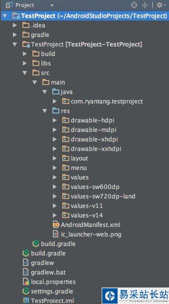 展開后可以看到Android Studio的目錄結構,和Eclipse的工程還是有一點區別的: