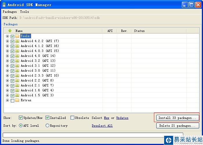 打開解壓出來的文件夾里面的 SDK Manager.exe (也可以運(yùn)行eclipse/eclipse.exe 然后通過Windows -> Android SDK Manager打開)