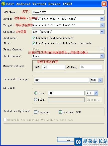 點(diǎn)擊 New按鈕 創(chuàng)建你一新的AVD,如下圖,我做了一個(gè)簡單說明,參數(shù)其實(shí)你都是可以自己隨意填的,點(diǎn)擊OK就行了。