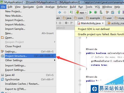 2、在彈出的下拉的菜單中,可以直接選中“project structure”的選項(xiàng)。