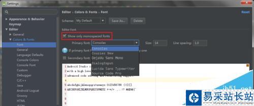 1、首先在菜單欄找到File菜單,然后File>Settings>Editor>Colors & Fonts>Font,準備修改字體。不幸的是,Android Studio自帶的Scheme是不允許修改字體的,如下圖所示。